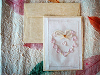 This is a new Pastel b. design for Valentine's Day, sewn with satin lace to outline the heart silhouette, decorated with pale pink hearts and a satin bow with a gold sequin as a final touch.